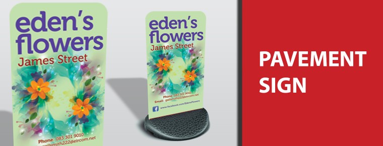 These eco-flex pavement signs are really cost effective, durable and eye-catching. They are ideal for outdoor advertisement and are easy to carry in and out of your premises but won’t blow away! We have just completed this eye-catching pavement sign for Eden’s Flowers in Kiltimagh, Co. Mayo.