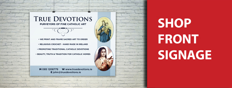 Here is a shop front sign we designed and printed for our Mayo based client True Devotions who are based in Knock, Co. Mayo and are an irish owned business that are purveyors of fine catholic art. Their services include the printing and framing of sacred art to order, religious crochet as well as promoting traditional catholic values. If you have a shop front that needs that something bit extra why not call us on: 094 938 2000 or email us : info@signwest.ie.