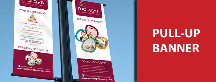 Here are some premium pull up/roll up banners we have recently completed for Molloys Pharmacy who have pharmacies in Ballina, Ballaghaderreen, Roscommon & Crossmolina. Molloys Lifestyle Pharmacies and Health Stores was set up in 1998 after the original Molloys Pharmacy, which was established in 1958, was purchased. The ethos of the group is centered around the welfare of the patient and how to improve the overall customer experience. The Molloys Pharmacy Group regards pharmacy as central to the life and health of all its customers and are based all over Co. Roscommon and Co. Mayo.