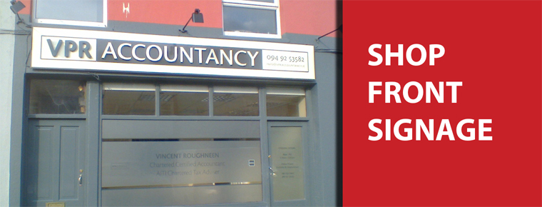 Here are some outdoor shop front signage which includes frosted glass and cut vinyl lettering that we recently completed for VPR Accountancy who are based in Swinford, Co. Mayo and are an irish owned accountancy firm that provide services that include bookkeeping, accounts preparation, filing tax returns with the Revenue Commissioners and annual returns with the Companies Registration Office. If you have a shop front that needs that something bit extra why not call us on: 094 938 2000 or email us : info@signwest.ie.